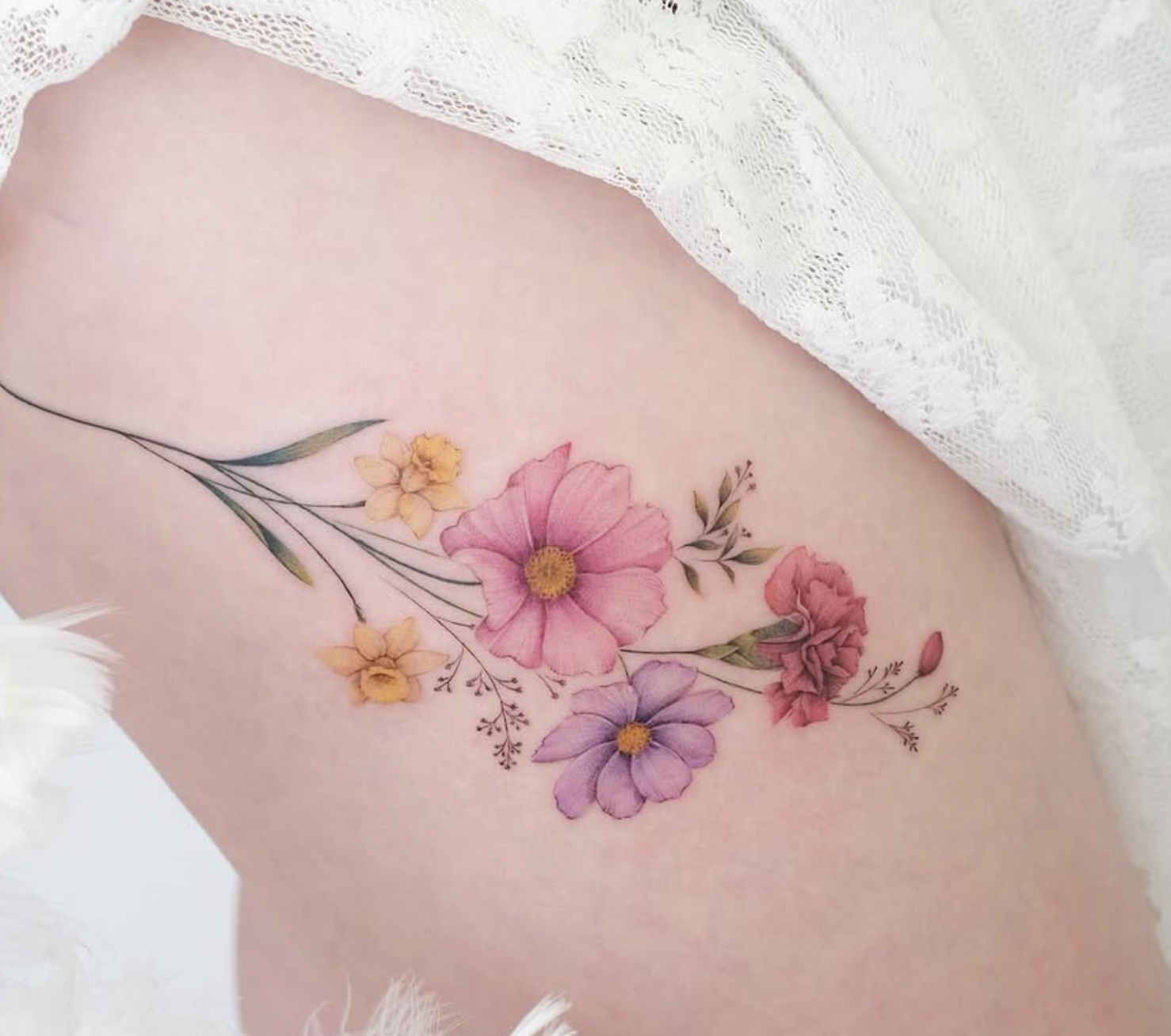 Stem tattoos naturally flow along organic body curves. Consider placement on the ribcage for vertical growth patterns, shoulders for spreading designs, or forearms for showcase pieces. Back pieces allow for expansive natural scenes.